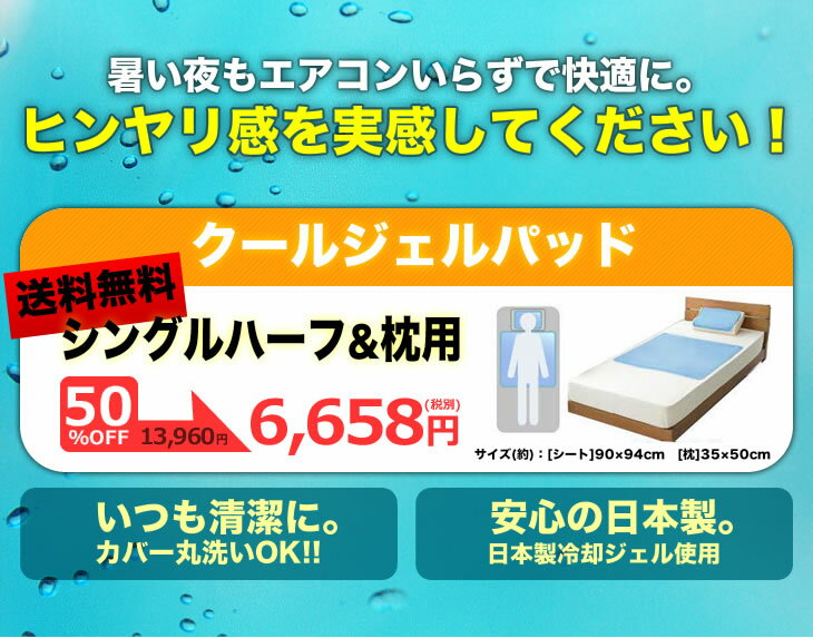 【送料無料】【50%OFF】日本製ジェルカバー丸洗いOKで清潔エコで省エネ【ポイント10倍!】【50%OFF】クールジェルパッドシングルハーフ・枕用セット【送料無料】【クールジェルパット】広告掲載店舗 価格: 6,980円 レビュー評価:4.04 レビュー数:26 暑い夜をエアコンなし-エコで快適に!安心の日本製冷却ジェル使用カバー丸洗いでいつも清潔!クールジェルパッド ★ 裏面メッシュ素材で通気性に優れ快適に熱を逃がします! ※ 写真はクールジェルパッド・まくら用です。 【ポイント1】 エコで快適♪エアコンいらずで快眠 冷却ジェルパッドで、暑い寝苦しい夜も、心地よい睡眠ができます。 エアコンなどの電気を使用せずに冷却するので、 地球にやさしい エコ&省エネ です。【ポイント2】 冷却ジェルは安心の日本製 こだわりの日本製冷却ジェル使用。 食品添加物だから安心です。 (※ 食べ物ではありません)【ポイント3】 カバーはご家庭で丸洗いOK! ジェル Supported by 楽天ウェブサービス |